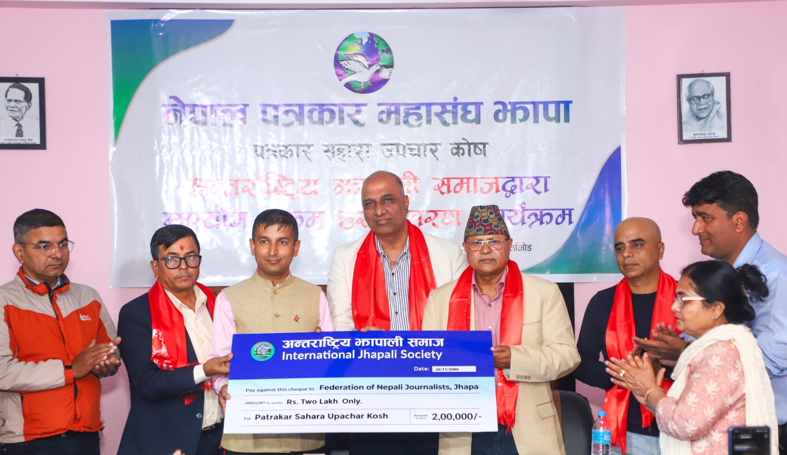 नेपाल पत्रकार महासंघ झापा शाखाले स्थापना गरेको पत्रकार सहारा उपचार कोषमा समाजले शनिबार बिर्तामोडमा आयोजित कार्यक्रमका वीच दुई लाख रुपैयाँको चेक महासंघ झापाका अध्यक्ष एकराज गिरीलाई प्रदान गरेको हो ।