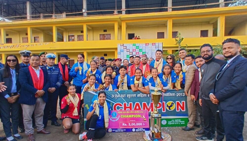 झापा, २१ मंसिर । नेपाल पुलिस क्लब झापामा सम्पन्न अर्जुनधारा खुला महिला भलिबल प्रतियोगिताको च्याम्पियन बनेको छ । आज भएको फाइनल प्रतिस्पर्धामा अर्को विभागीय टोली सशस्त्र प्रहरीको एपिएफ क्लबलाई हराउँदै पुलिसले उपाधि उचालेको हो ।