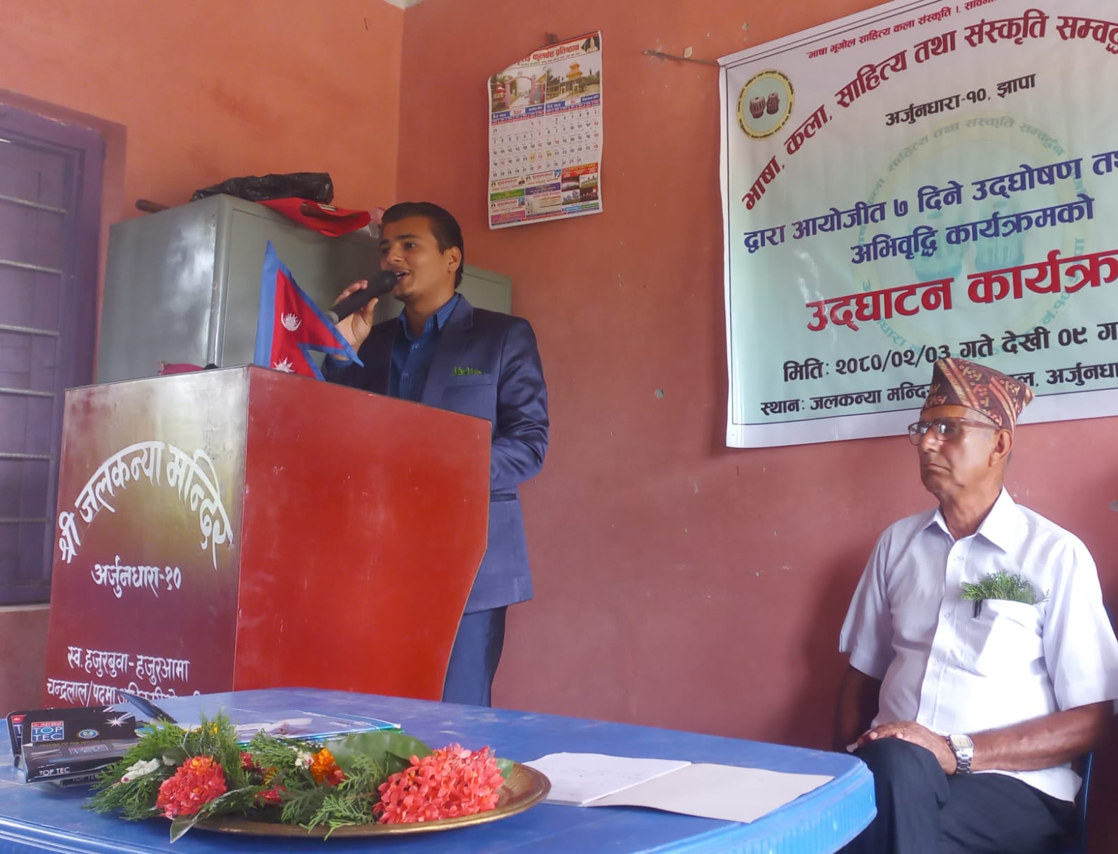 संस्थाका अध्यक्ष कुलप्रसाद बरालको अध्यक्षतामा भएको तालिम उद्घाटन समरोहमा अर्जुनधारा-१० का वडा सदस्यद्वय डम्बर द्यौराली, सीता परियार, नेपाली कांग्रेस अर्जुनधारा-१० का सभापति यज्ञलाल श्रेष्ठ, ५ नं.टोल विकास समितिका अध्यक्ष हरिराज भट्टराई लगायतले शुभकामना मन्तव्य राखेका थिए ।