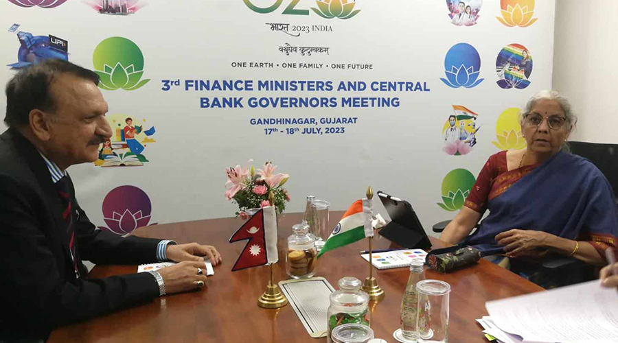काठमाडौँ, २ साउन । भारतको गुजरातमा भइरहेको जी-२० मुलुकका अर्थमन्त्रीहरूको बैठकका अवसरमा अर्थमन्त्री डा प्रकाशशरण महत र भारतीय अर्थमन्त्री निर्मला सीतारमणबीच आपसी सहयोग र द्विपक्षीय सम्बन्धका बारेमा छलफल भएको छ ।