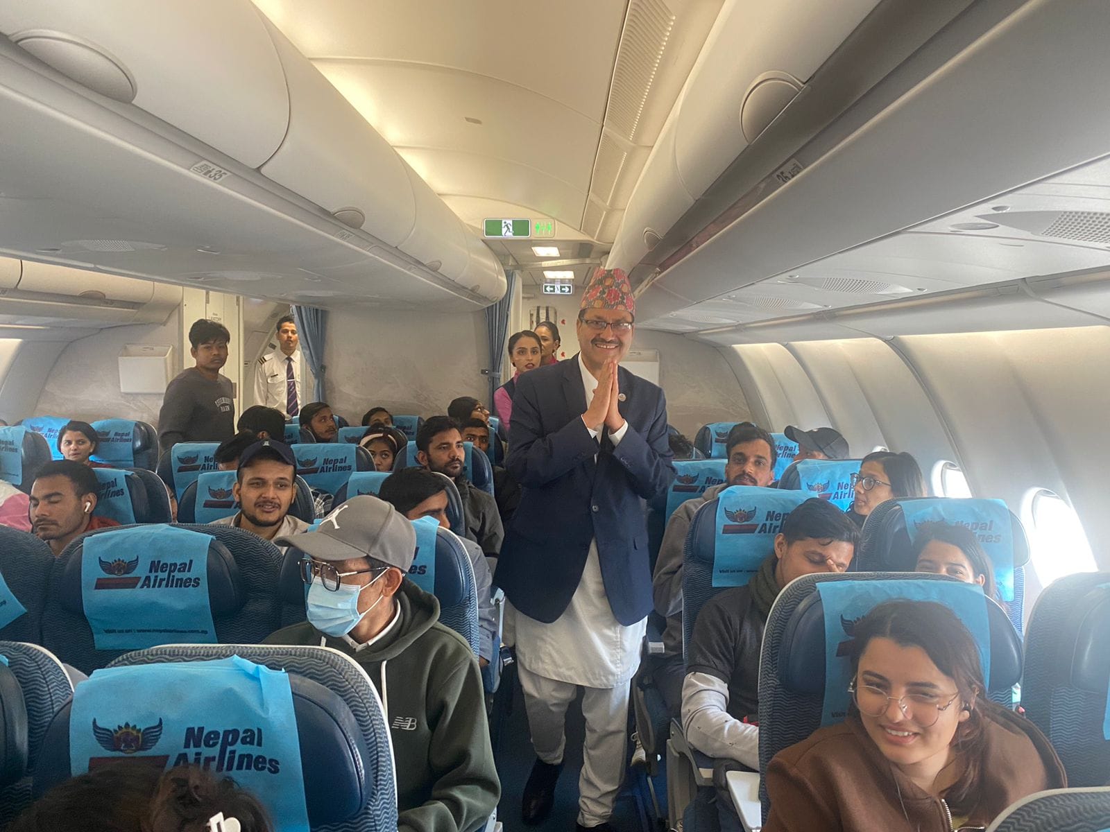 नेपाली नागरिकको उद्धारका लागि विमान आज बिहान ३:३० बजे दुबई हुँदै त्यसतर्फ प्रस्थान गरेको थियो । उद्धारका लागि परराष्ट्रमन्त्री नारायणप्रकाश साउद विमानमा आफैँ इजरायल गएका छन् । इजरायलबाट स्वदेश फर्कन चाहने नेपाली ल्याउनका लागि नेपाल एयरलाइन्सको दुई सय ७४ सिट क्षमता भएको वाइडबडी विमान इजरायल गएको हो ।