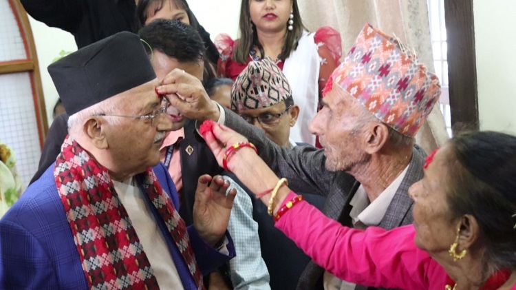 त्यही क्रममा ओलीले आफन्त र सर्वसाधारणलाई पनि टीका लगाइ दिएका थिए । उनले पार्टीका स्थानीय नेता, कार्यकर्ता, समर्थक, शुभेच्छुकहरूलाई टीका, जमरा लगाइ दिए ।