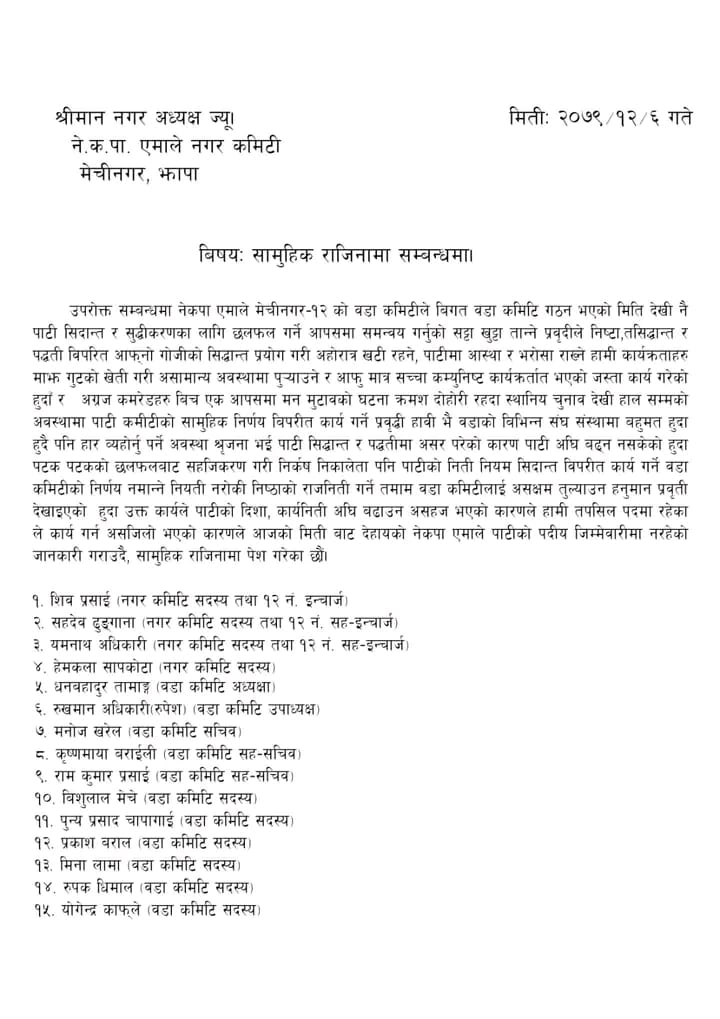 मेचीनगर, ६ चैत । नेकपा एमाले मेचीनगर-१२ का इञ्चार्जसहित १५ जना विभिन्न जिम्मेवारीमा रहेकाहरुले एकै पटक पार्टीको पदीय जिम्मेवारीबाट अलग भएको घोषणा गरेका छन ।