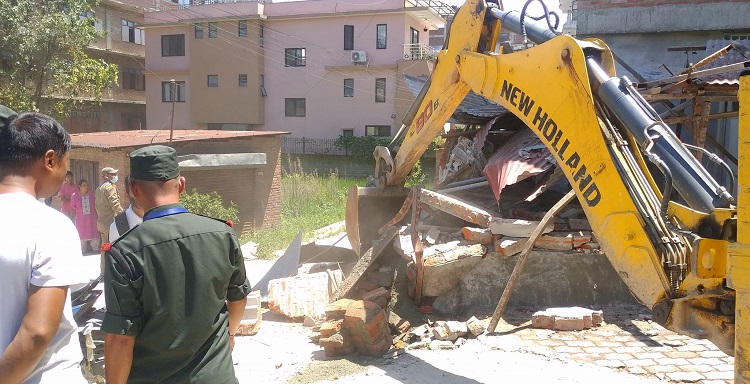 नगरपालिकाले जयबहादुर महर्जनको घर जग्गामा बनाएको संरचना भत्काएको हो । नक्सा पास नभएको ठाउँमा संरचना बनाएको, अग्लो पर्खाल बनाएको र त्यहाँ टहरा बनाएको भन्दै नगरपालिकाले डोजर चलाएको हो ।