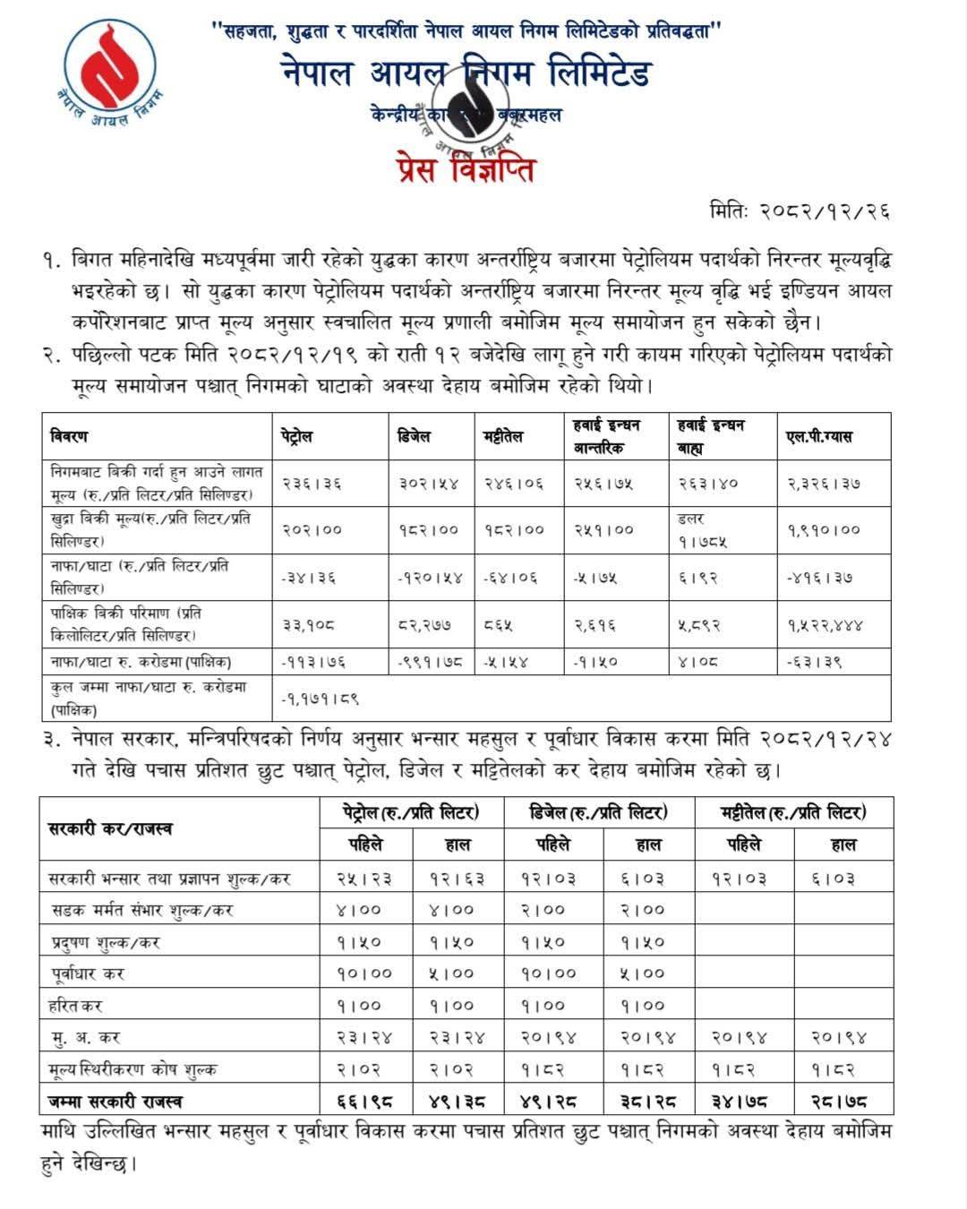 पछिल्लो मूल्यअनुसार पेट्रोलमा प्रतिलिटर १७ रुपैयाँ र डिजेल/मट्टितेलमा प्रतिलिटर २५ रुपैयाँ बढेको हो । खाना पकाउने एलपी ग्यासमा प्रतिलिटर एक सय रुपैयाँ बढेको छ । नयाँ मूल्यअनुसार अब १४.२ केजी ग्यास प्रतिलिसिलिण्डरको मूल्य २ हजार १० रुपैयाँ पुगेको छ ।