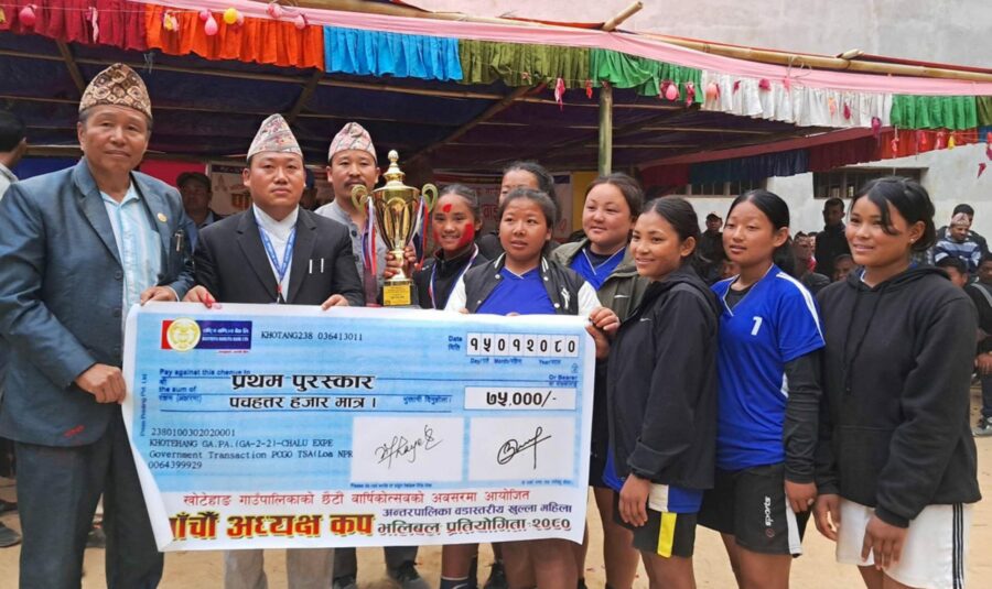 खोटाङ, १६ वैशाख । खोटेहाङ गाउँपालिका अध्यक्ष कप’ भलिबल प्रतियोगिताको पाँचौँ संस्करणको पुरुषतर्फको उपाधि सङ्खुवासभाको सभापोखरी गाउँपालिका-३ बाह्रबिसे तथा महिलातर्फको उपाधि भोजपुरको रामप्रसाद राई गाउँपालिका-८ बासिखोराले जितेको छ ।