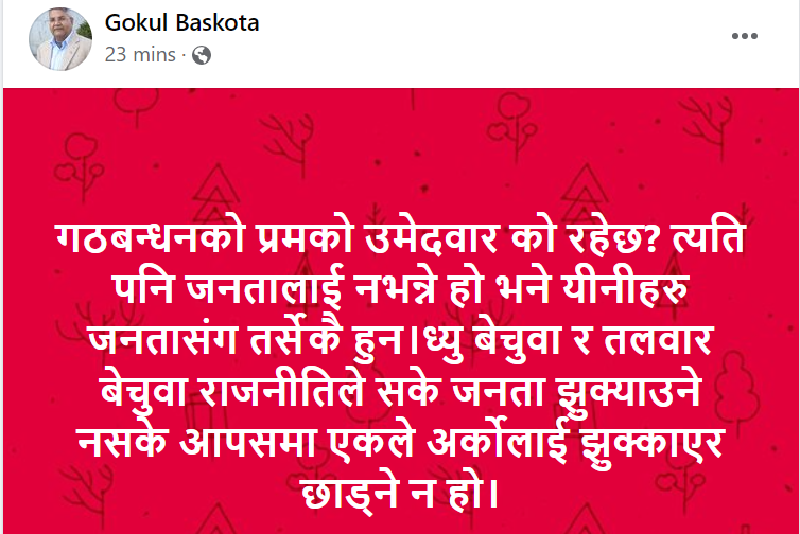 ‘गठबन्धनको प्रमको उमेदवार को रहेछ ? त्यति पनि जनतालाई नभन्ने हो भने यिनीहरु जनतासँग तर्सेकै हुन्,’ बास्कोटाले सामाजिक सञ्जाल ट्वीटरमा लेखेका छन् । गठबन्धनका दलहरु जनतालाई झुक्याउन लागिपरेको उनले बताएका छन् ।