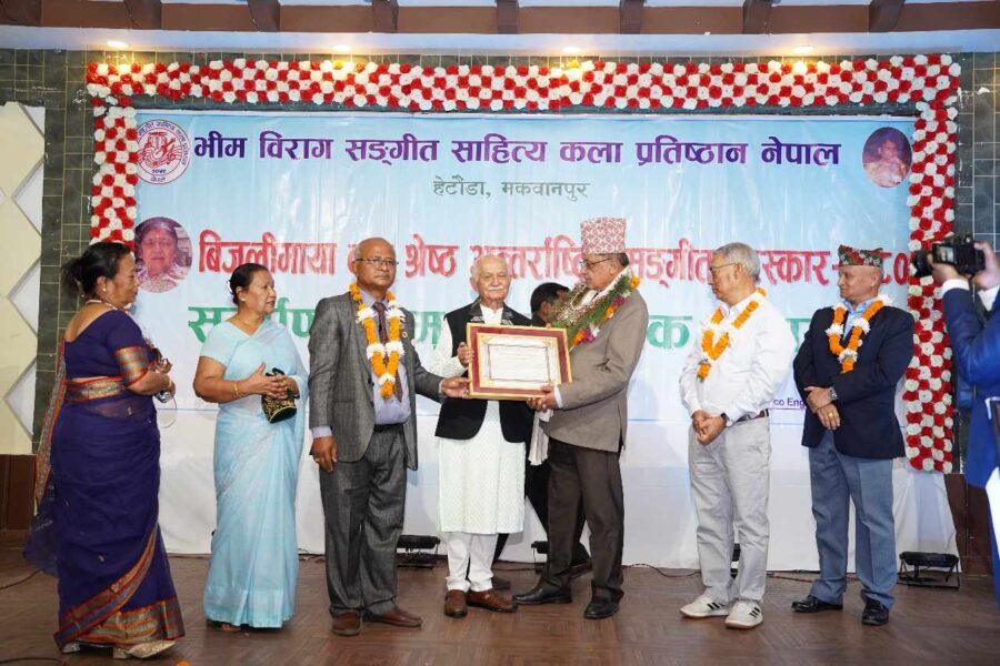 मनहरी, ३० चैत । भीम विराग सङ्गीत साहित्य कला प्रतिष्ठानले गीतकार राजेन्द्र थापा र गायिका निशा देशारलाई सम्मान गरेको छ । गीतकार थापा रु एक लाख राशिको ‘बिजुली माया वनः श्रेष्ठ अन्तर्राष्ट्रिय सङ्गीत पुरस्कार’बाट थापा सम्मानित भएका हुन् ।