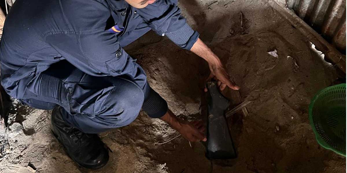 खोजतलासीका क्रममा टहराको भुईमा बालुवाले पुरेर राखिएको अवस्थामा बटमा १३२०४४७ नम्बर अंकित सर्ट गनको बटसहित बेसाबुत हतियारको पार्टपुर्जा फेला परेको प्रहरीले जनाएको छ।