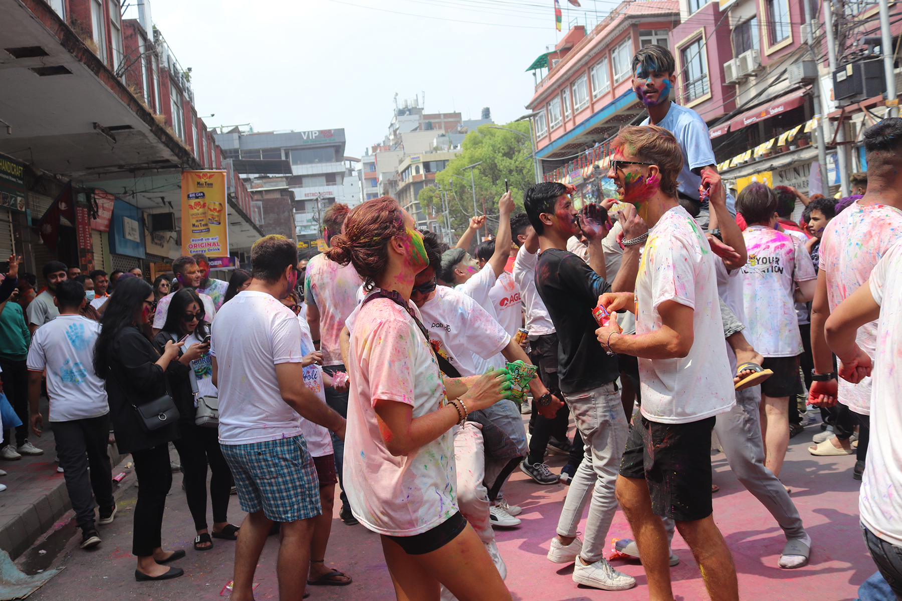 काठमाडौँ, ११ चैत । सङ्घीय राजधानी काठमाडौँको प्रमुख पर्यटकीय गन्तव्य ठमेललगायत विश्वसम्पदा क्षेत्रमा विदेशी पर्यटकले पनि हर्षोल्लासका साथ होली पर्व मनाएका छन् ।