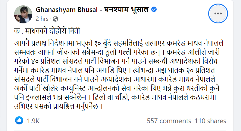 “कमरेड ओलीले जारी गरेको ४० प्रतिशत सांसदले पार्टी विभाजन गर्न पाउने सम्बन्धी अध्यादेशको विरोध गर्नेमा कमरेड माधव नेपाल पनि अगाडि हुनुहुन्थ्यो” नेता भुसालले भनेका छन्, “त्योभन्दा अझ घातक २० प्रतिशत सांसदले पार्टी विभाजन गर्न पाउने अध्यादेशका आधारमा कमरेड माधव नेपालले अर्को पार्टी खोलेर कम्युनिस्ट आन्दोलनको सेवा गरेको थिए भन्ने कुरा धर्तीको कुनै पनि इजलासले भन्न सक्ने छैन, ढिलो वा चाँडो, कमरेड माधव नेपालले कठघरामा उभिएर यसको प्रायश्चित्त गर्नुपर्नेछ ।”