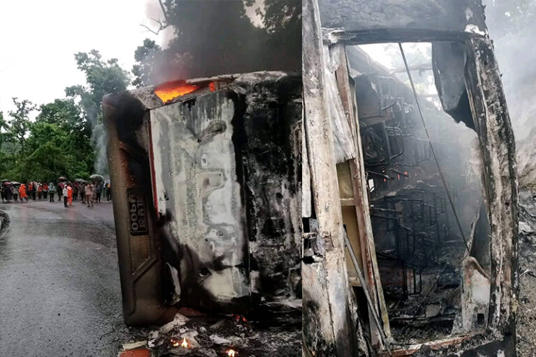 आज बिहान साढे ५ बजे विनयी त्रिवेणी गाउँपालिका-२ स्थित दाउन्ने सडकखण्डको विश्वकर्मा मन्दिर नजिक बस दुर्घटना भई आगलागी भएको हो ।