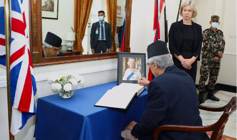 काठमाडौँ, २५ भदौ । प्रधानमन्त्री शेरबहादुर देउवाले शनिबार बिहान काठमाडौँस्थित बेलायती दूतावासमा पुगेर बेलायती महारानी एलिजावेथ द्धितीयको निधनप्रति गहिरो दुःख व्यक्त गरेका छन् । साथै, प्रधानमन्त्री देउवाले दूतावासमा राखिएको शोक पुस्तिकामा शोक सन्देश पनि लेखेका छन् ।