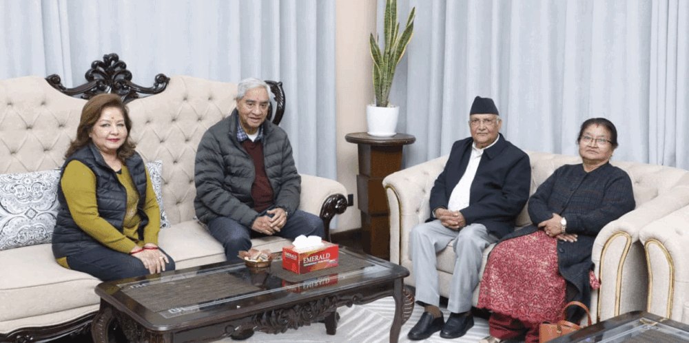 भेटवार्तामा सभापति देउवाकी धर्मपत्नी तथा काँग्रेस नेतृ डा. आरजु राणा देउवा र अध्यक्ष ओलीकी धर्मपत्नी राधिका शाक्य पनि सहभागी थिए।