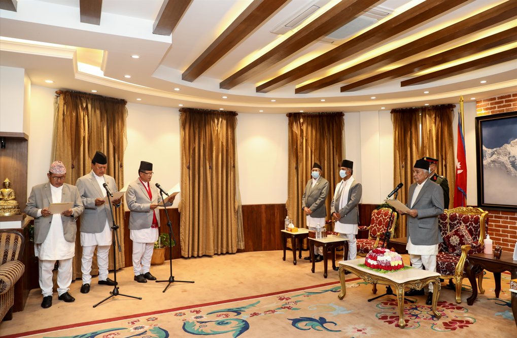 काठमाडौँ, २१ वैशाख । नवनियुक्त तीन मन्त्रीले पद तथा गोपनीयताको शपथ लिएका छन् । कानुन, न्याय तथा संसदीय मामिलामन्त्री धनराज गुरुङ, स्वास्थ्य तथा जनसङ्ख्यामन्त्री मोहनबहादुर बस्नेत र युवा तथा खेलकुदमन्त्री डिगबहादुर लिम्बूले शपथ लिएका हुन् । राष्ट्रपति कार्यालय शीतल निवासमा आज आयोजित विशेष समारोहमा राष्ट्रपति रामचन्द्र पौडेलले उनीहरुलाई शपथ गराएका हुन् ।