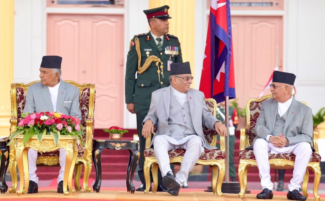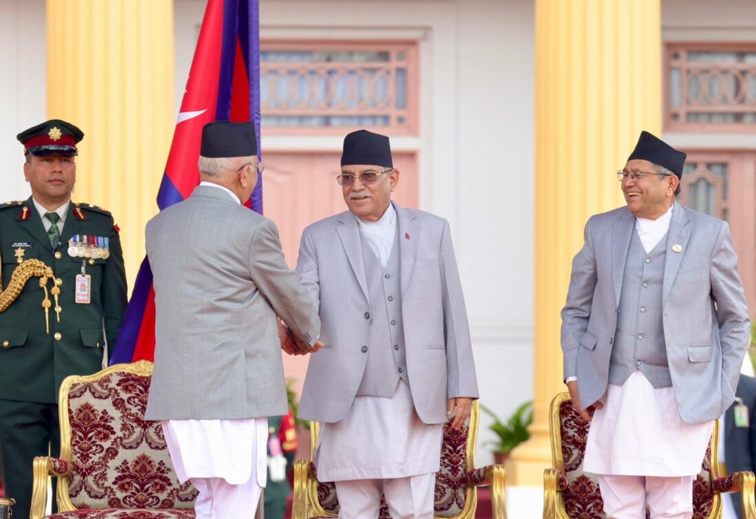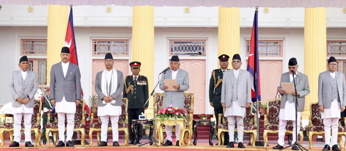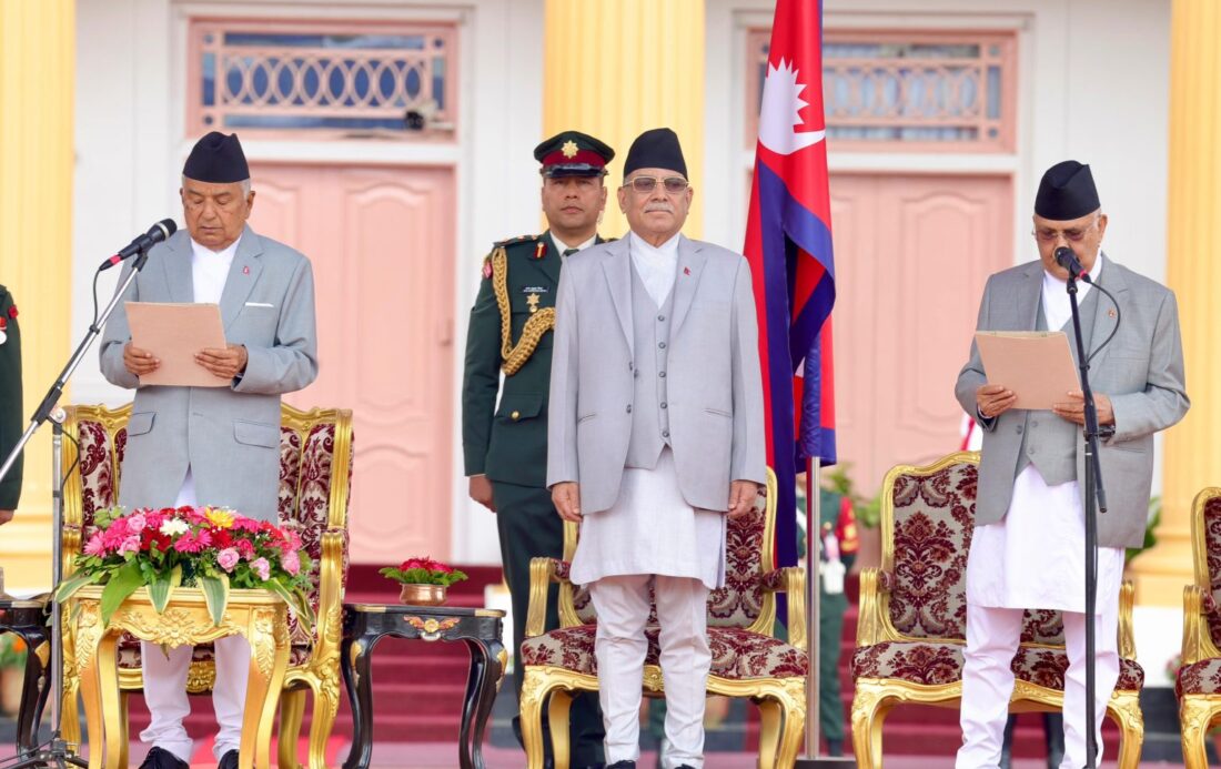 राष्ट्रपति रामचन्द्र पौडेलले प्रधानमन्त्रीलाई शपथ खुवाउनु भएको हो भने त्यसपछि राष्ट्रपतिको उपस्थितिमा प्रधानमन्त्रीले मन्त्रीहरूलाई शपथ गराउनु भएको हो ।