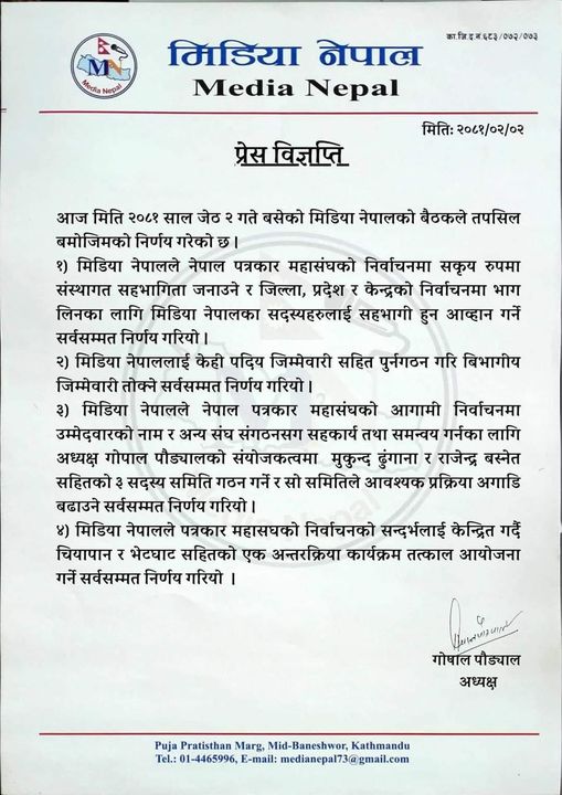 मिडिया नेपालको आज बसेको बैठकले महत्वपूर्ण ४ वटा निर्णय गरेको अध्यक्ष गोपाल पौड्यालद्वारा हस्ताक्षरित विज्ञप्तीमा जनाइएको छ । पत्रकार महासंघको आगामी निर्वाचनमा उम्मेदवार छान्न तथा अरु संघ संगठनसँग समन्वय गर्नका लागि मिडिया नेपालले अध्यक्ष पौड्यालको संयोजकत्वमा मुकुन्द ढुंगाना र राजेन्द्र वस्नेत सदस्य रहेको समिति गठन गरेको छ । मिडिया नेपालले केही पदीय जिम्मेवारीसहित संस्था पुनर्गठन गरेको पनि जनाएको छ ।