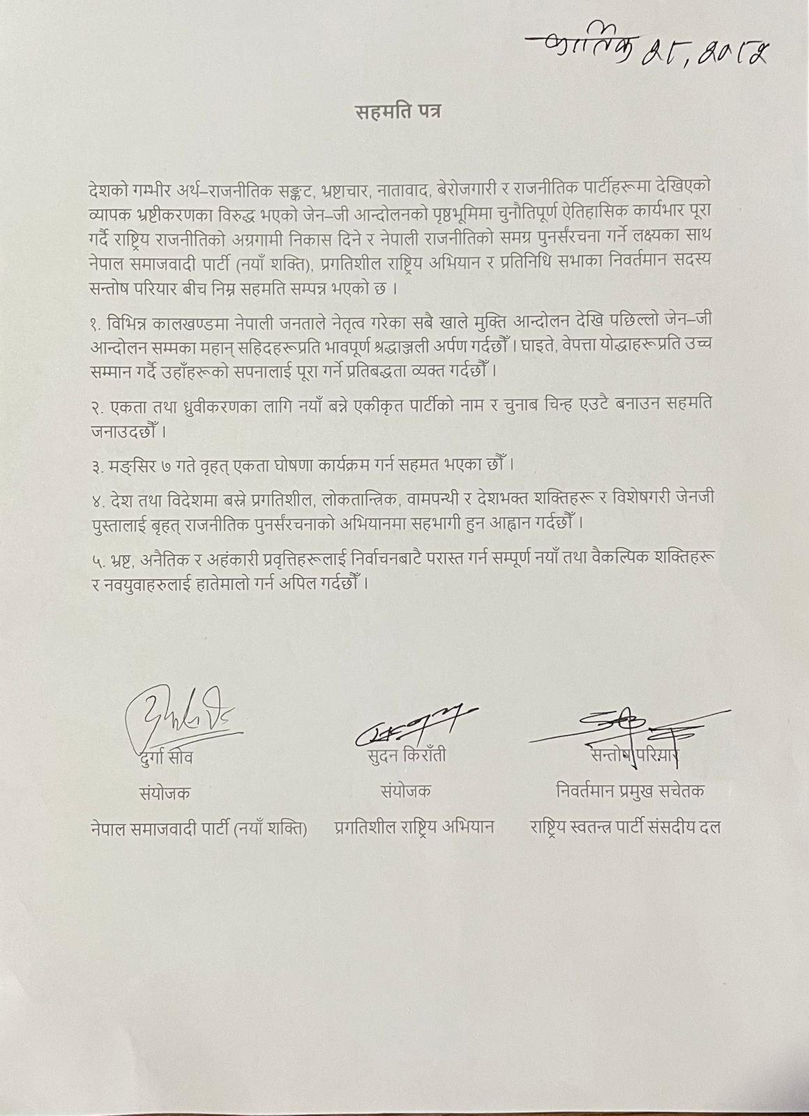 काठमाडौं, २८ कार्तिक । नेपाल समाजवादी पार्टी (नयाँ शक्ति), प्रगतिशील राष्ट्रिय अभियान र हालसालै राष्ट्रिय स्वतन्त्र पार्टी छोडेका सन्तोष परियारबीच पाँच बुँदे सहमति भएको छ।