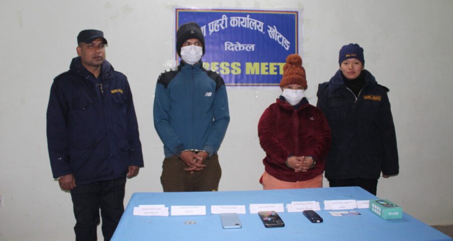 खोटाङ, १९ पुस । दिक्तेल रुपाकोट मझुवागढी नगरपालिका–१० पाथेकास्थित नाखामकी ३६ वर्षीय पवित्रा तामाङको हत्या आरोपमा सोही नगरपालिकाको वडा नं १२ जालपाका ३३ वर्षीय दीपक श्रेष्ठ र उनकी श्रीमती २५ वर्षीया सिर्जना श्रेष्ठ (राई) पक्राउ परेका छन् । गत मङ्सिर १९ गतेदेखि बेपत्ता बनेकी पवित्रा घरदेखि करिब १५ मिनेट पैदल दूरीमा रहेको गोठमा यही पुस ३ गते शङ्कास्पद अवस्थामा मृत फेला परेपछि प्रहरीले पवित्राको हत्या आरोपमा श्रेष्ठ दम्पतीलाई पक्राउ गरेको हो ।