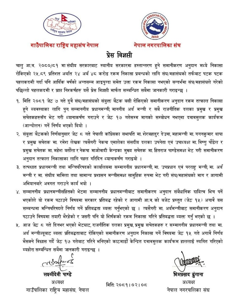नेपाल नगरपालिका सङ्घका अध्यक्ष भीम ढुङ्गानाले चालु आर्थिक वर्षको अन्तिम किस्ताको वित्तीय समानीकरण अनुदान सरकारले कटौती गरेपछि पालिका निकै समस्यामा परेको बताउनुभयो । बजेट काटिएपछि पालिकाले निर्माण व्यवसायी तथा उपभोक्तालाई दिनुपर्ने रकम दिन नसकेको उहाँले बताउनुभयो ।