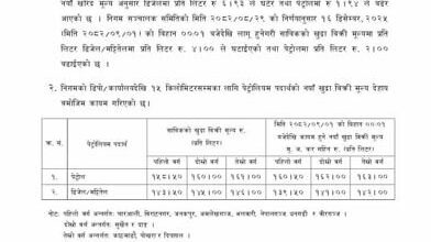 नयाँ निर्णयअनुसार पेट्रोल प्रतिलिटर २ रुपैयाँले वृद्धि गरिएको छ। त्यसैगरी, डिजेल र मट्टितेलको मूल्य प्रतिलिटर ४ रुपैयाँले घटाइएको छ। मूल्य समायोजन आजैबाट लागू हुने निगमले जनाएको छ।