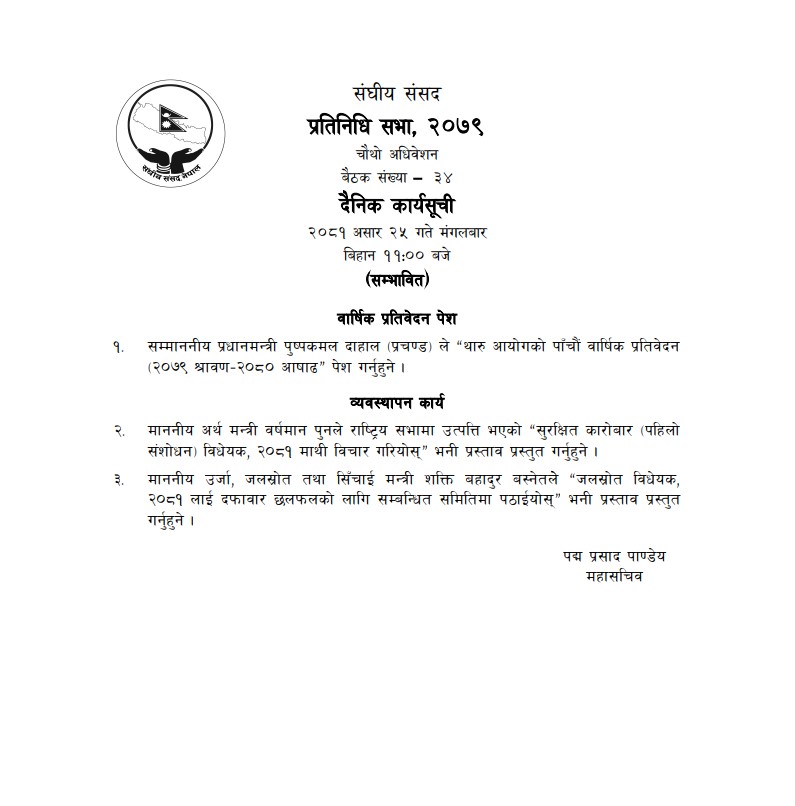 बिहान ११ बजे बस्ने बैठक नयाँ बानेश्वरस्थित संसद भवनमा बस्नेछ । बैठकमा प्रधानमन्त्री पुष्पकमल दाहाल ‘प्रचण्ड’ले थारु आयोगको पाँचौँ वार्षिक प्रतिवेदन पेश गर्ने कार्यसूची छ ।