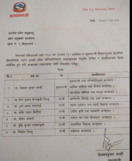 विराटनगर, ६ माघ । प्रदेश १ का मुख्यमन्त्री हिक्मतकुमार कार्कीले मन्त्रीहरुको जिम्मेवारी तोकेका छन् । मन्त्रिपरिषद्को शुक्रबार बसेको बैठकले ४ वटा मन्त्रालय खारेज गरेर ९ वटा कायम गर्नासाथ कार्कीले मन्त्रीहरुलाई जिम्मेवारी दिएका हुन् ।