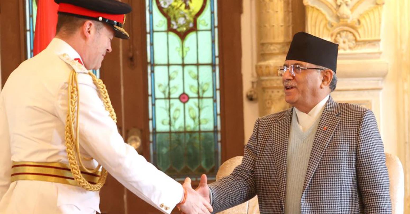 काठमाडौँ, १६ माघ । प्रधानमन्त्री पुष्पकमल दाहाल ‘प्रचण्ड’सँग बेलायती सेनाका सेनाध्यक्ष जनरल सर प्याट्रिक स्यान्डर्सले शिष्टाचार भेट गरेका छन् ।