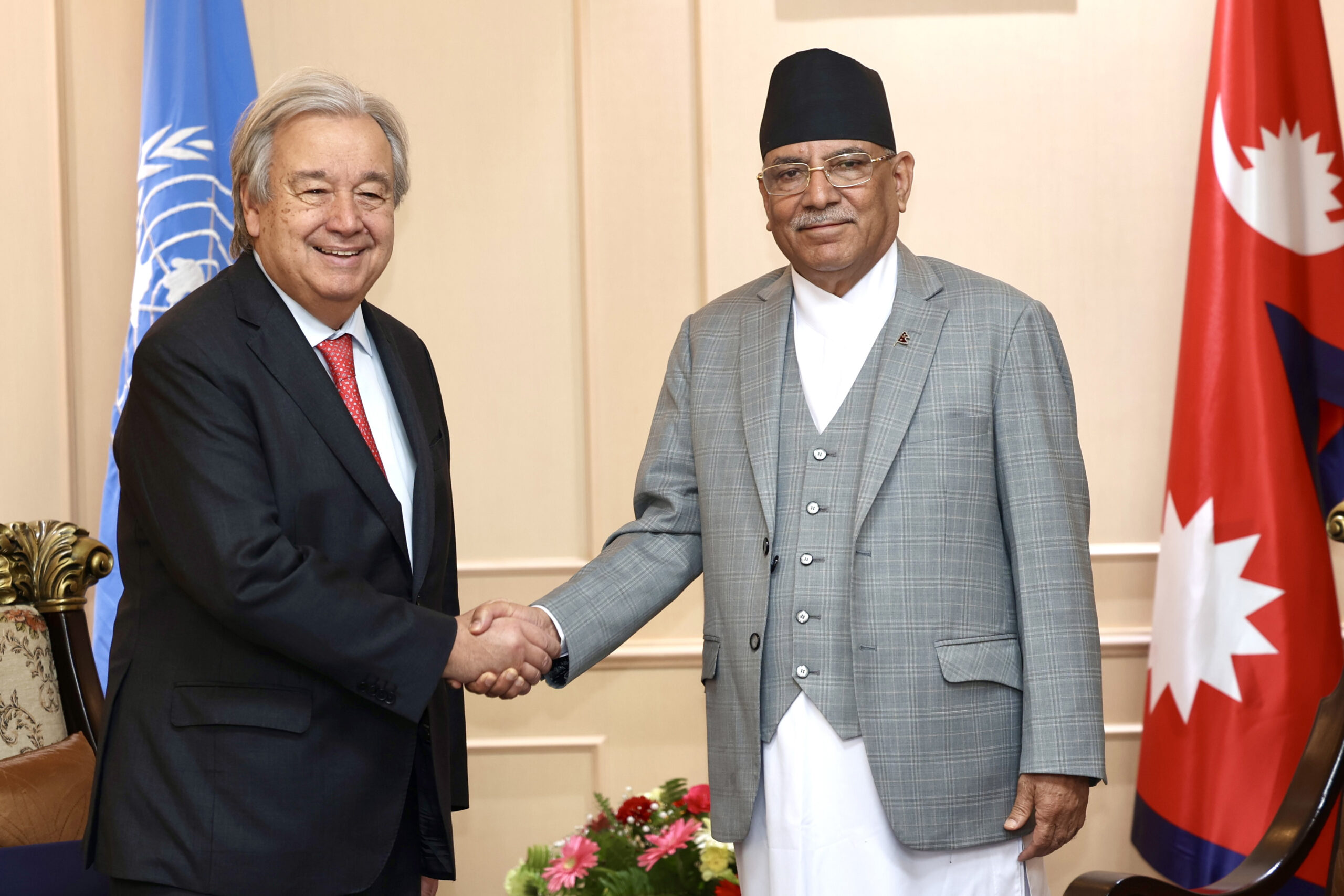 काठमाडौँ, १२ कात्तिक । नेपाल भ्रमणमा रहेका संयुक्त राष्ट्रसङ्घका महासचिव एन्टोनियो गुटेरेसले प्रधानमन्त्री पुष्पकमल दाहाल ‘प्रचण्ड’सँग भेट गरेका छन् ।