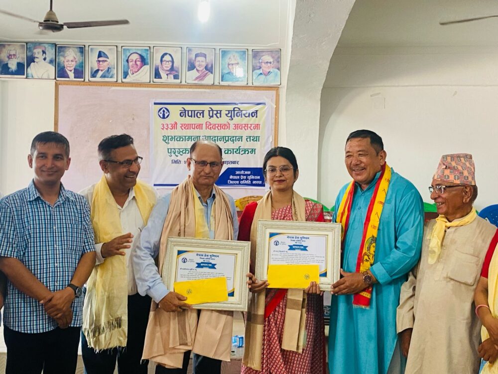 झापा, १३ जेठ । नेपाल प्रेस युनियन झापाले ३३ औं स्थापना दिवसको अवसर पारेर दुईजना पत्रकारलाई सम्मान गरेको छ ।