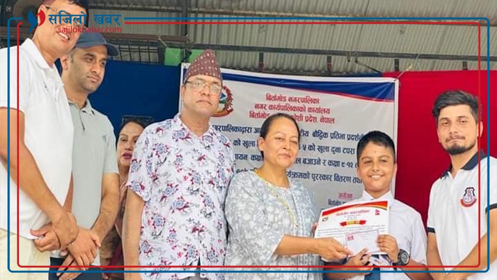 शिक्षा शाखा प्रमुख उपसचिव तिलचन भण्डारीको अध्यक्षतामा आयोजित कार्यक्रममा विजयी प्रतियोगीहरूलाई नगर प्रमुख, उप प्रमुखसंगै शिक्षक महासङ्घका अध्यक्ष युवराज कट्टेल, सचिव उमनाथ भण्डारी, दुर्गा माविका प्रधानाध्यापक लक्ष्मण शिवाकोटी, सरस्वती माविका प्रधानाध्यापक दीपक लुइटेल, महेन्द्र रत्न माविका प्रधानाध्यापक खड्ग प्रसाद खरेल लगायतले नगदसहित पुरस्कार तथा प्रमाणपत्र प्रदान गर्नुभयो ।