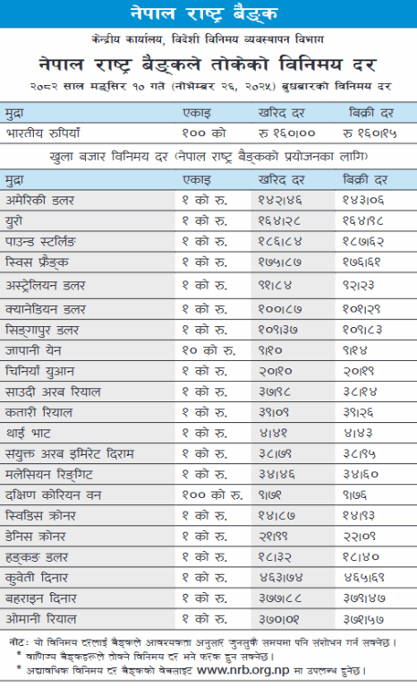 हेर्नुहोस् नेपाल राष्ट्र बैंकले सार्वजनिक गरेको विदेशी मुद्राको विनिमय दरको सुची :