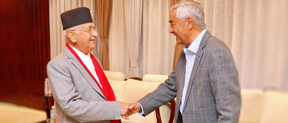देउवा निवास बुढानीलकण्ठमा बुधबार साँझ उहाहरूबिच २ घण्टा भेटवार्ता भएको हो। आफूलाई प्रधानमन्त्री बनाउन हस्ताक्षर नै तयार गरिसकेका देउवालाई भेट्न ओली बुढानिलकण्ठस्थित उहाकै निवासमा पुग्नुभएको हो।