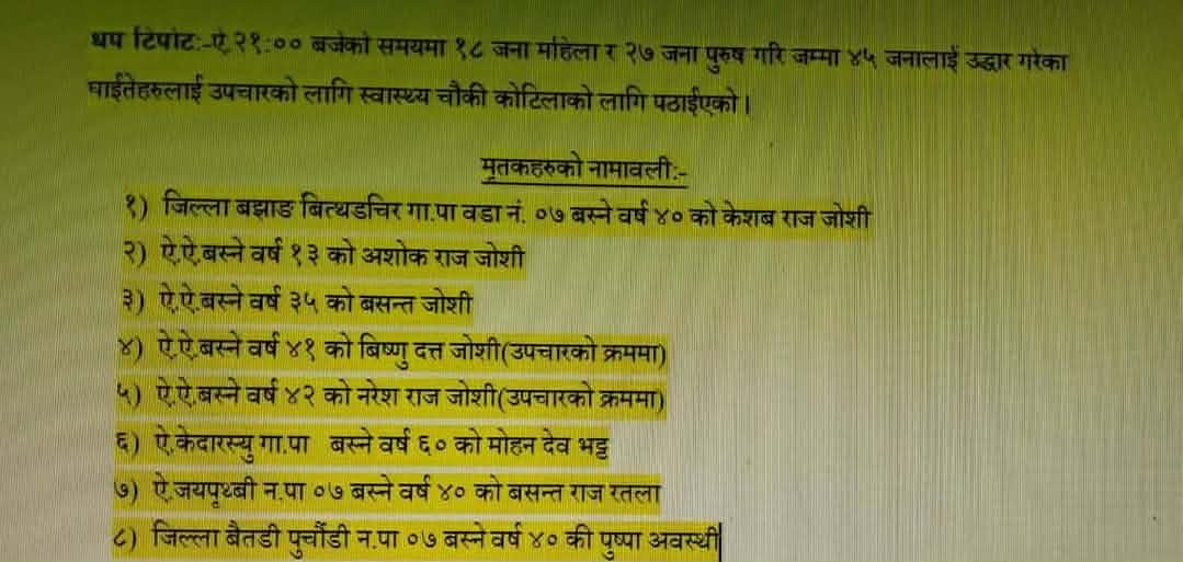 पुर्चौडीबाट बझाङतर्फ जन्ती लिएर जाँदै गरेको पवनदूत यातायातको सुपप्र ०२००१ ख १११९ नम्बरको बस सडकबाट करिब २०० मिटर तल खसेको प्रहरीले जनाएको छ।