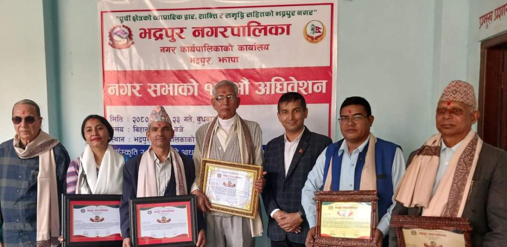 भद्रपुर, २४ फागुन । भद्रपुर नगरपालिकाले ६ जना पत्रकार र चार खेलाडीलाई नगदसहित पुरस्कृत गरेको छ । भद्रपुरले नगर सभाको १३ औं अधिवेशनको अवसरमा बुधबार भद्रपुरका अग्रज पत्रकार तथा साहित्यकार नकुल काजी र अग्रज पत्रकार गोविन्दचन्द्र छेत्रीलाई ‘जीवनपर्यन्त योगदान पुरस्कार’, प्रदान गरिएको छ ।