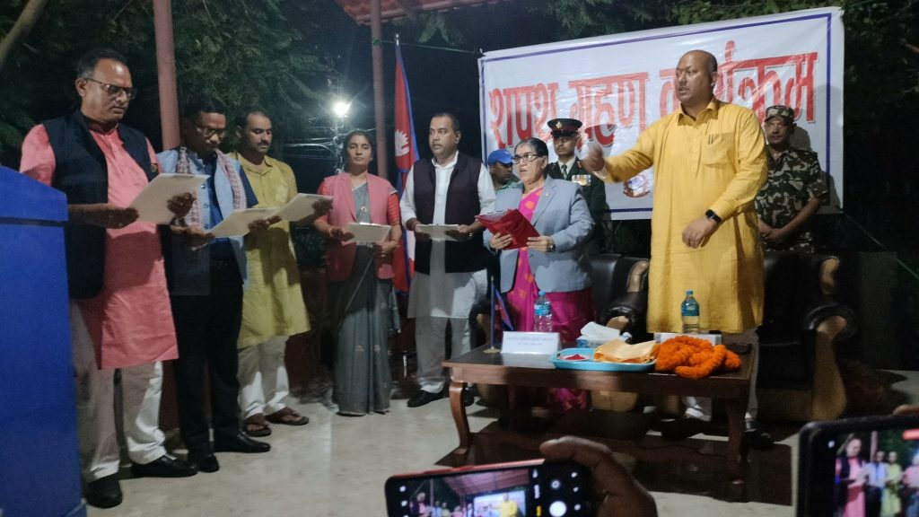 जनकपुरधाम, ३ साउन । मधेश प्रदेशका प्रमुख सुमित्रा सुबेदी भण्डारीले मधेश प्रदेश सरकारमा नियुक्त हुनुभएका पाँच जना मन्त्रीलाई आज पद तथा गोपनीयताको शपथ ग्रहण गराउनुभएको छ ।