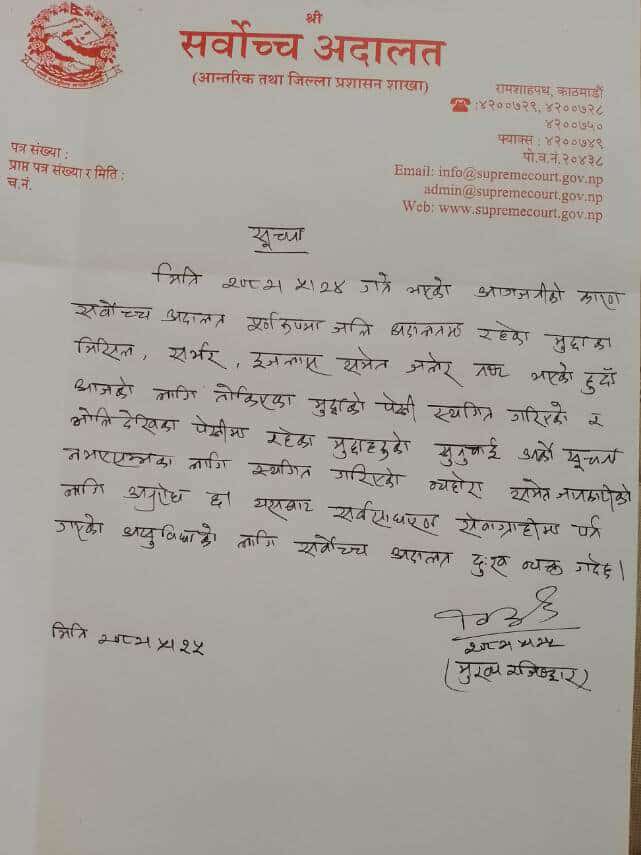 मिसिल, सर्भर, इजलास सबै जलेको भन्दै सर्वोच्चले अर्को सूचना नभएसम्म सुनवाइ हुन नसक्ने जानकारी गराएको छ । मंगलबार जेनजीको आन्दोलनका क्रममा सर्वोच्च अदालतमा आगजनी भएको थियो ।
