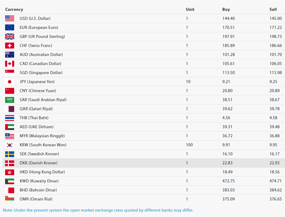 आज अमेरिकी डलर १ को खरिददर १४४ रुपैयाँ ४० पैसा र बिक्रीदर १४५ रुपैयाँ छ। हिजो अमेरिकी डलर १ को खरिददर १४६ रुपैयाँ १३ पैसा र बिक्रीदर १४६ रुपैयाँ ७३ पैसा थियो।