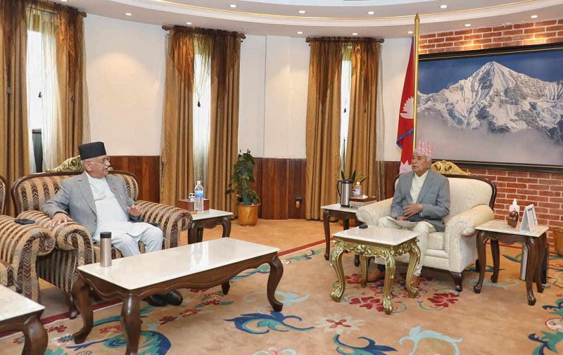 काठमाडौँ, ३१ साउन । राष्ट्रपति रामचन्द्र पौडेलसँग प्रमुख प्रतिपक्षी दल नेकपा (एमाले)का अध्यक्ष केपी शर्मा ओलीले आज राष्ट्रपति भवन शीतल निवासमा भेटवार्ता गरेका छन् ।