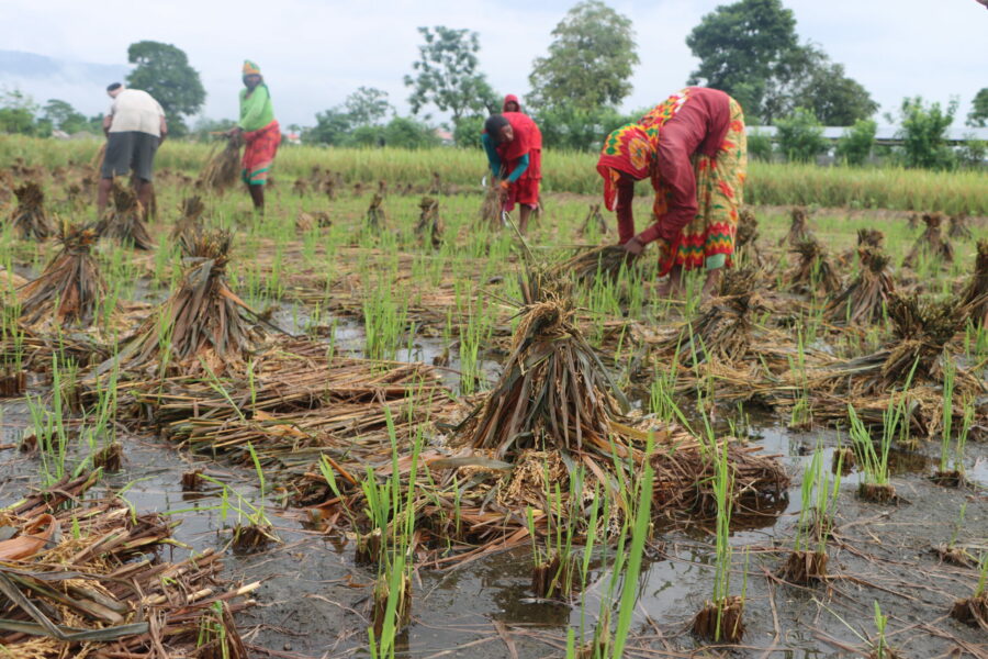 निरन्तरको वर्षाले खेतमा भित्र्याउन काटेर सुकाएको धान डुबाएको भरतपुर महानगरपालिका–१६ स्थित शरणपुरका सुनिल दवाडीले बताए । “मैले दुई बिघामा धान लगाएको हो । त्यसमध्ये एक बिघामा लगाएको धान रौतहटबाट खेताला ल्याएर कटाएको थिएँ”, खेतमा पानीले निथ्रुक्क भिजेको धान उठाउँदै गर्दा भेटिएका उनले भने, “धान रोप्न गरेको लगानी पनि खेर गयो ।” खेत रोप्न रु २५ हजार लागेको उनले बताए । लगातार परेको पानीमा डुबेर धान उम्रिएको छ ।