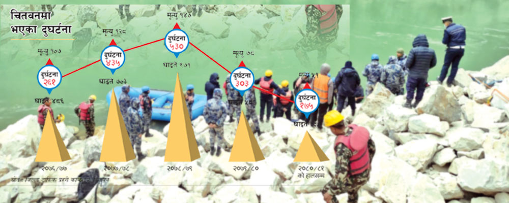 नारायणगढ, ३ माघ । गुणस्तर सुधार भए पनि नारायणगढ–मुग्लिङ सडक खण्डमा दुर्घटना नियन्त्रण हुन सकेको छैन । तीन ठुला राजमार्गसँग जोडिएको चितवनमा साढे चार वर्षको अवधिमा एक हजार ७०४ वटा सडक दुर्घटना भएका छन् । दुर्घटनाका कारण ५०४ जनाले ज्यान गुमाएका छन् । जिल्ला ट्राफिक प्रहरी कार्यालय चितवनका अनुसार यस अवधिमा दुर्घटनाकै कारण तीन हजार ७६ जना घाइते भएका छन् ।