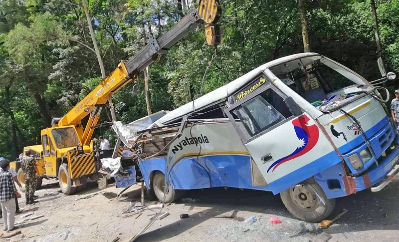 सल्लाघारीमा बाटोमाथिको रुख एक्कासि ढलेर सडकमा गुडिरहेको बस र स्कुटरलाई किच्दा उक्त दुर्घटना भएको महानगरीय प्रहरी परिसर भक्तपुर सूचना अधिकारी प्रहरी नायब उपरीक्षक राजु पाण्डेले जानकारी दिए ।