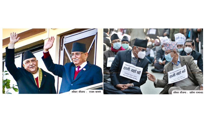 दुई वर्षपछि बालकोट पुगेका प्रचण्डलाई ओलीले प्रसन्न मुद्रामा स्वागत गरेको तस्बिर थियो । जुन दिन ओलीले प्रचण्डलाई प्रसन्न मुद्रामा स्वागत गरेका थिए, ठीक दुई वर्षअघि आजकै दिनको तस्बिर (दोस्रो तस्बिर) भने फरक थियो । दुई वर्षअघि तत्कालीन नेपाल कम्युनिस्ट पार्टीको विवाद उत्कर्षमा पुग्दा प्रचण्ड र हाल नेकपा (एकीकृत समाजवादी) का अध्यक्ष माधवकुमार नेपाल हामी यहाँ छौँ भन्ने नारा छातीमा टाँसेर माइतीघरमा सडक धर्नामा थिए ।