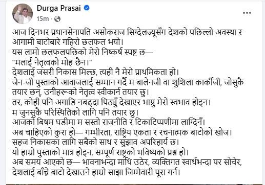 बुधबार प्रधान सेनापति अशोकराज सिग्देलसँगको भेटपछि तस्बिर सार्वजनिक गर्दै उहाले “जेन–जी पुस्ताको आवाजलाई सम्मान गर्दै बालेन शाह वा सुशीला कार्की जो सुकै भएपनि नेतृत्व स्वीकार्न तयार रहेको बताउनुभएको हो ।