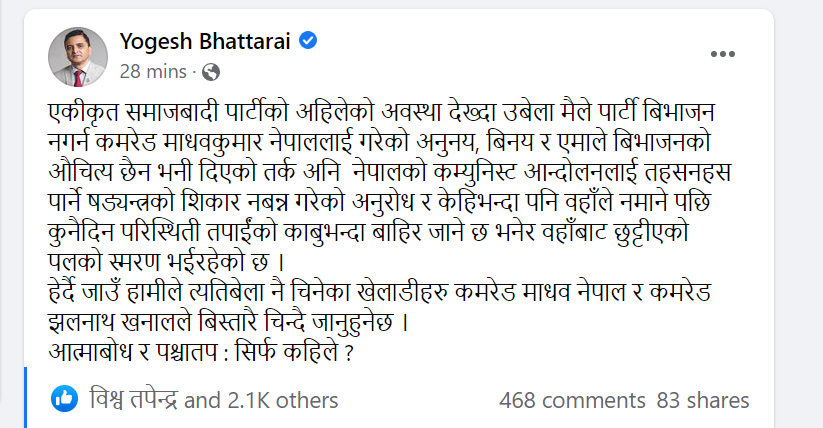 ‘एकीकृत समाजवादी पार्टीको अहिलेको अवस्था देख्दा उबेला मैले पार्टी विभाजन नगर्न कमरेड माधवकुमार नेपाललाई गरेको अनुनय, विनय र एमाले विभाजनको औचित्य छैन भनी दिएको तर्क अनि नेपालको कम्युनिस्ट आन्दोलनलाई तहसनहस पार्ने षड्यन्त्रको सिकार नबन्न गरेको अनुरोध र केहीभन्दा पनि वहाँले नमानेपछि कुनै दिन परिस्थिति तपाईंको काबुभन्दा बाहिर जाने छ भनेर उहाँबाट छुट्टिएको पलको स्मरण भइरहेको छ । हेर्दै जाउँ हामीले त्यतिबेला नै चिनेका खेलाडीहरु कमरेड माधव नेपाल र कमरेड झलनाथ खनालले विस्तारै चिन्दै जानुहुनेछ,’ भट्टराईले शुक्रबार सामाजिक सञ्जालमा लेखेका छन् ।