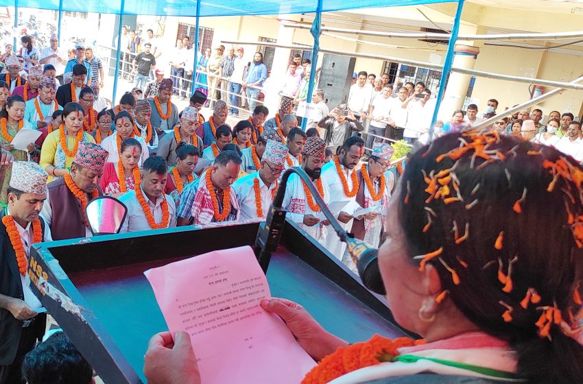 नगर प्रमुख पवित्रा महतरा प्रसाईले उपप्रमुख नगेन्द्र सङ्ग्रौलासहित नव निर्वाचित ५१ जना जनप्रतिनिधिलाई पद तथा गोपनीयताको सपथ गराएकी छन् ।
