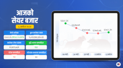 काठमाडौँ, ८ असोज । धितोपत्र बजारमा मङ्गलबार शेयर कारोबार मापक नेप्से परिसूचक झण्डै ५९ अङ्कले ओरालो लागेको छ । नेपाल स्टक एक्सचेञ्जका अनुसार नेप्से परिसूचक ५८ दशमलव ९३ अङ्कले ओरालो