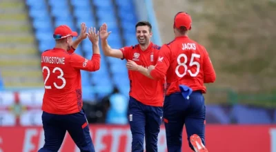 काठमाडौँ, २ असार। आईसीसी टी-२० विश्वकप अन्तर्गत गएराति भएको खेलमा इंग्ल्याण्डले नामिबियाविरुद्ध ४१ रनको जित निकालेको छ। वर्षाले अवरोध गरेपछि १० ओभरमा झारिएको खेल डिएल म्याथोडमा इग्ल्याण्डले ४१ रनको जित