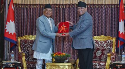 काठमाडौँ, २९ माघ । राष्ट्रपति रामचन्द्र पौडेलसमक्ष प्रधानमन्त्री तथा राष्ट्रिय सुरक्षा परिषद्का अध्यक्ष पुष्पकमल दाहाल ‘प्रचण्ड’ले राष्ट्रिय सुरक्षा परिषद्को आर्थिक वर्षको वार्षिक प्रतिवेदन पेश गरेका छन् । राष्ट्रपति कार्यालयका अनुसार