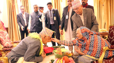 काठमाडौँ, ७ कात्तिक । राष्ट्रपति रामचन्द्र पौडेलले ९१ वर्षीया भाउजू विष्णुमाया पौडेलबाट दसैँको टीका, जमरा, प्रसाद र आशिर्वाद ग्रहण गरेका छन् । साथै गुरु पुरोहितबाट पनि दसैँको दीका, जमरा, प्रसाद